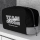 El kit de diseño de dopp personalizado para tus padrinos presenta "EQUIPO NOVIO" en negrita gris claro sobre un fondo negro sólido. Personaliza el nombre del padrino en escritura blanca crujiente. El título o texto personalizado aparece debajo. ¡Todos los colores en este diseño son personalizables en la herramienta de diseño de Zazzle! Mensaje con preguntas o solicitudes de color personalizado.