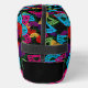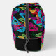 Diseño abstracto sobre fondo negro con entramado de hojas verdes de césped que simboliza el punto en común de España y Nueva Zelanda por ser antípodas. Las rodajas de kiwi neozelandeses se confunden con los abanicos españoles, con el color rojo pasión y tonos rosas de España, el azul del Mediterráneo y el verde de Nueza Zelanda.