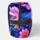 Presentando el gráfico "Fantasía floral" de ELGN, este diseño vibrante muestra una serie de flores ilustradas en tonos de naranja rosado, en tonos azules, en contraste con un telón de fondo negro audaz. El estilo clásico captura una esencia floral, combinando elementos florales con un toque artístico de una bruja llamativa que irradia un ambiente alegre y encantador.