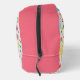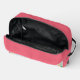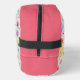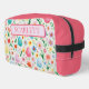 Hermosos huevos de Pascua de color pastel y flores de primavera están esparcidos por todo el mundo en un patrón caprichoso en la parte delantera y trasera de este neceser. Un banner en la parte superior tiene una plantilla fácil de usar para poner su nombre en el bolso. Los lados y la parte superior de la bolsa están en un rosa oscuro coordinador. Este bolso de bonito es perfecto para maquillaje o artículos de aseo para una excursión nocturna.