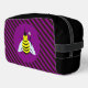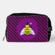 Esta impresionante bolsa de cosméticos tiene un lindo mago de abejas amarillas con rayas negras. El Bee tiene grandes ojos negros brillantes y lindas antenas negras. Las alas de la abeja están dobladas para que se vean como una capa. La abeja lleva un alto gorra negro con estrellas naranjas y moradas. Además, está sosteniendo una varita mágica con forma de estrella y con muchos colores diferentes. El fondo es un patrón de rayas moradas y negras.