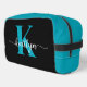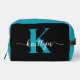 Este sencillo y elegante bolso de tocador negro con tu primer nombre en un estilo de letra moderno en blanco y tu primera inicial en un moderno tipo de letra en verde azulado es perfecto para ti. Es de diseño y a la vez muy clásico. Será fabuloso para la escuela, el gimnasio, el trabajo, tu auto - hará que tu maquillaje o artículos de aseo estén en un solo lugar cuando estés lejos de casa.