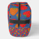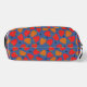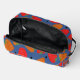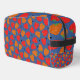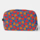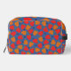 Bolsa de cosmética divertida y linda con un patrón de fresas rojas y naranjas en azul con flores negras esparcidas entre las fresas.