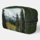 Bolso de artículos de tocador con cremallera dopp que incluye una imagen panorámica y paisajística de un paisaje de nevado en el monte Rainier y un paisaje subalpino con árboles de siempre verde, junto con una parte superior y laterales de color verde oscuro. Bolso de accesorios perfecto para sus productos de aseo para los viajes en directo.