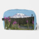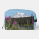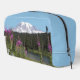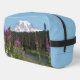 Bolso de artículos de tocador con cremallera dopp que incluye una foto panorámica de flores silvestres nevadas del monte Rainier y de las hierbas rojas que crecen a lo largo de la orilla de un lago, junto con un sólido techo azul claro y los lados. Bolso de accesorios perfecto para sus productos de aseo para los viajes en directo.