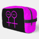 Esta impresionante bolsa de cosméticos está diseñada para lesbianas. Cuenta con dos símbolos femeninos rosados uno al lado del otro. El fondo es negro y hay un texto rosa personalizable dentro de cada uno de los símbolos para poner nombres.