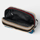 El diseño de esta bolsa de artículos de aseo presenta un impresionante diseño de rayas horizontales de color azul verde azulado, marrón marrón oscuro, rojo marrón oscuro, negro y crema de marfil sobre un fondo negro. La variedad de esta combinación de colores crea un efecto dinámico y rítmico. La decoración es a la vez elegante y ornamentada, con un toque de honestidad y un toque de hipster. También hay espacio para el personalizar o la personalización con un monograma o una inicial de su elección. Ya sea buscando una moda y un estilo moderno o una vitalidad vintage y retro, este patrón se adaptará a su gusto y personalidad.