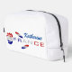 La bolsa de cosmética y artículos de aseo personalizados, o el kit Dopp, cuenta con una bandera de Francia subió. Una forma divertida de compartir tu orgullo por tu herencia, ancestros y cultura francesas. El diseño muestra un color rosa en la tricolor azul, blanco y rojo de Francia. Las hojas están decoradas de la misma manera. Pero el tallo es la palabra FRANCIA, también en los colores de la bandera. A la derecha hay un lugar para añadir un nombre para personalizar tu regalo. Ideal para el Día de la Bastilla. Bonito regalo del Día de la Madre. Diversión para reuniones familiares, grupos de viajes y clubes.