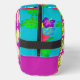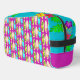 Surfboards y bolso de tocador con flores de hibisco. Surfboards con diseños tropicales e hibiscos de colores vivos y hojas decoran esta bolsa con cremallera. Añadir un monograma inicial al frente dentro de un círculo rosa brillante. Una cremallera en la parte superior permite acceder fácilmente a los elementos esenciales. Los colores son rosa claro, azul acuático y verde limón, con flores amarillas, violetas y rosas. La colocación del diseño cambiará para otros tipos de bolsos, y puede que no encaje correctamente en todos los estilos de bolsos.