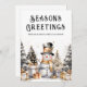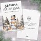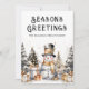 Envía cálidos deseos a clientes, socios o empleados con esta encantadora tarjeta de Navidad empresarial que presenta un diseño festivo de un muñeco de nieve en acuarela. La parte frontal muestra un encantador muñeco de nieve en blanco y negro que lleva un sombrero de copa y una bufanda dorada, rodeado de acentos dorados, árboles festivos y regalos, lo que le da un ambiente invernal caprichoso y acogedor.