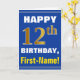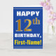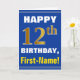 Este sencillo diseño de tarjetas de felicitación con temática de cumpleaños presenta un cálido deseo de cumpleaños como "¡FELIZ 12º CUMPLEAÑOS, nombre!" en la parte delantera, en negrita con un fondo de color azul. El número de cumpleaños tiene un aspecto de color falso/imitación dorado. El nombre en la parte delantera se puede personalizar. El interior incluye un mensaje de cumpleaños de personalizable. Una tarjeta de felicitación como esta podría ser una manera divertida de entregar deseos de cumpleaños a alguien que está celebrando su duodécimo cumpleaños. [~Z0000278]