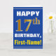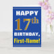Este sencillo diseño de tarjetas de felicitación con temática de cumpleaños presenta un cálido deseo de cumpleaños como "¡FELIZ 17 cumpleaños, nombre!" en la parte delantera, en negrita con un fondo de color azul. El número de cumpleaños tiene un aspecto de color falso/imitación dorado. El nombre en la parte delantera se puede personalizar. El interior incluye un mensaje de cumpleaños de personalizable. Una tarjeta de felicitación como esta podría ser una manera divertida de entregar deseos de cumpleaños a alguien que está celebrando su decimoséptimo cumpleaños. [~Z0000278]