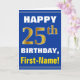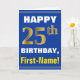 Este sencillo diseño de tarjetas de felicitación con temática de cumpleaños presenta un cálido deseo de cumpleaños como "¡FELIZ 25 cumpleaños, nombre!" en la parte delantera, en negrita con un fondo de color azul. El número de cumpleaños tiene un aspecto de color falso/imitación dorado. El nombre del frente puede ser personalizado. El interior incluye un mensaje de cumpleaños que se puede personalizar. Una tarjeta de felicitación como esta podría ser una manera divertida de entregar deseos de cumpleaños a alguien que está celebrando su vigésimo quinto cumpleaños. [~Z0000278]