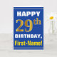 Este sencillo diseño de tarjetas de felicitación con temática de cumpleaños presenta un cálido deseo de cumpleaños como "¡FELIZ 29º CUMPLEAÑOS, nombre!" en la parte delantera, en negrita con un fondo de color azul. El número de cumpleaños tiene un aspecto de color falso/imitación dorado. El nombre en la parte delantera se puede personalizar. El interior incluye un mensaje de cumpleaños que se puede personalizar. Una tarjeta de felicitación como esta podría ser una manera divertida de entregar deseos de cumpleaños a alguien que está celebrando su vigésimo noveno cumpleaños. [~Z0000278]