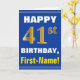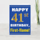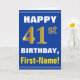 Este sencillo diseño de tarjetas de felicitación con temática de cumpleaños presenta un cálido deseo de cumpleaños como "¡FELIZ CUMPLEAÑOS, nombre!" en la parte delantera, en negrita con un fondo de color azul. El número de cumpleaños tiene un aspecto de color falso/imitación dorado. El nombre del frente puede ser personalizado. El interior incluye un mensaje de cumpleaños que se puede personalizar. Una tarjeta de felicitación como esta podría ser una manera divertida de entregar deseos de cumpleaños a alguien que esté celebrando su 41º cumpleaños. [~Z0000278]