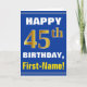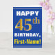 Este sencillo diseño de tarjetas de felicitación con temática de cumpleaños presenta un cálido deseo de cumpleaños como "¡FELIZ CUMPLEAÑOS 45, nombre!" en la parte delantera, en negrita con un fondo de color azul. El número de cumpleaños tiene un aspecto de color falso/imitación dorado. El nombre en la parte delantera se puede personalizar. El interior incluye un mensaje de cumpleaños que se puede personalizar. Una tarjeta de felicitación como esta podría ser una manera divertida de entregar deseos de cumpleaños a alguien que está celebrando su 45 cumpleaños. [~Z0000278]