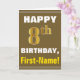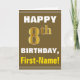 Este sencillo diseño de tarjetas de felicitación con temática de cumpleaños presenta un cálido deseo de cumpleaños como "¡FELIZ CUMPLEAÑOS, nombre!" en la parte delantera, en negrita con un fondo de color marrón. El número de cumpleaños tiene un aspecto de color falso/imitación dorado. El nombre en la parte delantera se puede personalizar. El interior incluye un mensaje de cumpleaños de personalizable. Una tarjeta de felicitación como esta podría ser una manera divertida de entregar deseos de cumpleaños a alguien que está celebrando su octavo cumpleaños. [~Z0000281]