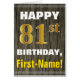 Este sencillo diseño de tarjetas de felicitación con temática de cumpleaños presenta un cálido deseo de cumpleaños como "¡FELIZ 81º CUMPLEAÑOS, nombre!" en la parte delantera, en negrita con un falso fondo de patrón de apariencia de madera. El número de cumpleaños tiene un aspecto de color falso/imitación dorado. El nombre del frente puede ser personalizado. El interior incluye un mensaje de cumpleaños que se puede personalizar. Una tarjeta de felicitación como esta podría ser una manera divertida de entregar deseos de cumpleaños a alguien que está celebrando su ochenta y primer cumpleaños. [~Z0000280]