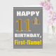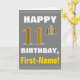 Este sencillo diseño de tarjetas de felicitación con temática de cumpleaños presenta un cálido deseo de cumpleaños como "¡FELIZ 11º CUMPLEAÑOS, nombre!" en la parte delantera, en negrita con un fondo gris (gris) de color. El número de cumpleaños tiene un aspecto de color falso/imitación dorado. El nombre en la parte delantera se puede personalizar. El interior incluye un mensaje de cumpleaños de personalizable. Una tarjeta de felicitación como esta podría ser una manera divertida de entregar deseos de cumpleaños a alguien que está celebrando su undécimo cumpleaños. [~Z0000283]