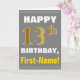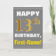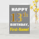 Este sencillo diseño de tarjetas de felicitación con temática de cumpleaños presenta un cálido deseo de cumpleaños como "¡FELIZ 13 cumpleaños, nombre!" en la parte delantera, en negrita con un fondo gris (gris) de color. El número de cumpleaños tiene un aspecto de color falso/imitación dorado. El nombre en la parte delantera se puede personalizar. El interior incluye un mensaje de cumpleaños de personalizable. Una tarjeta de felicitación como esta podría ser una manera divertida de entregar deseos de cumpleaños a alguien que está celebrando su decimotercer cumpleaños. [~Z0000283]