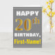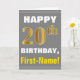 Este sencillo diseño de tarjetas de felicitación con temática de cumpleaños presenta un cálido deseo de cumpleaños como "¡FELIZ 20 cumpleaños, nombre!" en la parte delantera, en negrita con un fondo gris (gris) de color. El número de cumpleaños tiene un aspecto de color falso/imitación dorado. El nombre en la parte delantera se puede personalizar. El interior incluye un mensaje de cumpleaños de personalizable. Una tarjeta de felicitación como esta podría ser una manera divertida de ofrecer deseos de cumpleaños a alguien que está celebrando su vigésimo cumpleaños. [~Z0000283]
