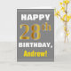 Este sencillo diseño de tarjetas de felicitación con temática de cumpleaños presenta un cálido deseo de cumpleaños como "¡FELIZ cumpleaños 28, Andrew!" en el frente, en negrita con un fondo gris (gris) de color. El número de cumpleaños tiene un aspecto de color falso/imitación dorado. El nombre en la parte delantera se puede personalizar. El interior incluye un mensaje de cumpleaños de personalizable. Una tarjeta de felicitación como esta podría ser una manera divertida de entregar deseos de cumpleaños a alguien que está celebrando su vigésimo octavo cumpleaños. [~Z0000283]