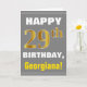 Este sencillo diseño de tarjetas de felicitación con temática de cumpleaños presenta un cálido deseo de cumpleaños como "¡FELIZ cumpleaños 29, Georgiana!" en el frente, en negrita con un fondo gris (gris) de color. El número de cumpleaños tiene un aspecto de color falso/imitación dorado. El nombre del frente puede ser personalizado. El interior incluye un mensaje de cumpleaños que se puede personalizar. Una tarjeta de felicitación como esta podría ser una manera divertida de entregar deseos de cumpleaños a alguien que está celebrando su vigésimo noveno cumpleaños. [~Z0000283]