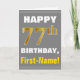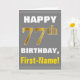Este sencillo diseño de tarjetas de felicitación con temática de cumpleaños presenta un cálido deseo de cumpleaños como "¡FELIZ CUMPLEAÑOS 77, nombre!" en la parte delantera, en negrita con un fondo gris (gris) de color. El número de cumpleaños tiene un aspecto de color falso/imitación dorado. El nombre en la parte delantera se puede personalizar. El interior incluye un mensaje de cumpleaños que se puede personalizar. Una tarjeta de felicitación como esta podría ser una manera divertida de entregar deseos de cumpleaños a alguien que está celebrando su cumpleaños setenta y siete. [~Z0000283]