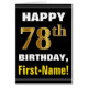 Este sencillo diseño de tarjetas de felicitación con temática de cumpleaños presenta un cálido deseo de cumpleaños como "¡FELIZ CUMPLEAÑOS 78, nombre!" en la parte delantera, en negrita con un fondo de color negro. El número de cumpleaños tiene un aspecto de color falso/imitación dorado. El nombre del frente puede ser personalizado. El interior incluye un mensaje de cumpleaños que se puede personalizar. Una tarjeta de felicitación como esta podría ser una manera divertida de entregar deseos de cumpleaños a alguien que está celebrando su cumpleaños setenta y ocho. [~Z0000275]
