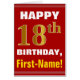 Este sencillo diseño de tarjetas de felicitación con temática de cumpleaños presenta un cálido deseo de cumpleaños como "¡FELIZ 18º CUMPLEAÑOS, nombre!" en la parte delantera, en negrita con un fondo de color rojo. El número de cumpleaños tiene un aspecto de color falso/imitación dorado. El nombre en la parte delantera se puede personalizar. El interior incluye un mensaje de cumpleaños de personalizable. Una tarjeta de felicitación como esta podría ser una manera divertida de ofrecer deseos de cumpleaños a alguien que está celebrando su decimoctavo cumpleaños. [~Z0000276]
