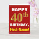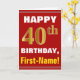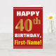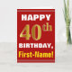 Este sencillo diseño de tarjetas de felicitación con temática de cumpleaños presenta un cálido deseo de cumpleaños como "¡FELIZ CUMPLEAÑOS, nombre!" en la parte delantera, en negrita con un fondo de color rojo. El número de cumpleaños tiene un aspecto de color falso/imitación dorado. El nombre del frente puede ser personalizado. El interior incluye un mensaje de cumpleaños de personalizable. Una tarjeta de felicitación como esta podría ser una manera divertida de ofrecer deseos de cumpleaños a alguien que está celebrando su cuadragésimo cumpleaños. [~Z0000276]