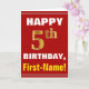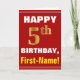 Este sencillo diseño de tarjetas de felicitación con temática de cumpleaños presenta un cálido deseo de cumpleaños como "¡FELIZ 5° cumpleaños, nombre!" en la parte delantera, en negrita con un fondo de color rojo. El número de cumpleaños tiene un aspecto de color falso/imitación dorado. El nombre del frente puede ser personalizado. El interior incluye un mensaje de cumpleaños que se puede personalizar. Una tarjeta de felicitación como esta podría ser una manera divertida de entregar deseos de cumpleaños a alguien que está celebrando su quinto cumpleaños. [~Z0000276]