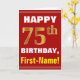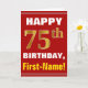 Este sencillo diseño de tarjetas de felicitación con temática de cumpleaños presenta un cálido deseo de cumpleaños como "¡FELIZ CUMPLEAÑOS 75, nombre!" en la parte delantera, en negrita con un fondo de color rojo. El número de cumpleaños tiene un aspecto de color falso/imitación dorado. El nombre en la parte delantera se puede personalizar. El interior incluye un mensaje de cumpleaños que se puede personalizar. Una tarjeta de felicitación como esta podría ser una manera divertida de entregar deseos de cumpleaños a alguien que está celebrando su cumpleaños setenta y cinco. [~Z0000276]