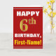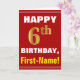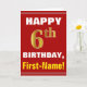 Este sencillo diseño de tarjetas de felicitación con temática de cumpleaños presenta un cálido deseo de cumpleaños como "¡FELIZ SEIS CUMPLEAÑOS, nombre!" en la parte delantera, en negrita con un fondo de color rojo. El número de cumpleaños tiene un aspecto de color falso/imitación dorado. El nombre del frente puede ser personalizado. El interior incluye un mensaje de cumpleaños que se puede personalizar. Una tarjeta de felicitación como esta podría ser una manera divertida de entregar deseos de cumpleaños a alguien que está celebrando su sexto cumpleaños. [~Z0000276]