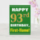 Este diseño de tarjeta de felicitación simple con tema de cumpleaños presenta un cálido deseo de cumpleaños como "FELIZ 93 CUMPLEAÑOS, Nombre!" en la parte delantera, en texto en negrita sobre un fondo de color verde. El número del cumpleaños tiene una apariencia de color dorado falso/imitación. El nombre en la parte delantera se puede personalizar. El interior presenta un mensaje de cumpleaños que se puede personalizar. Una tarjeta de felicitación como esta podría ser una forma divertida de enviar deseos de cumpleaños a alguien que está celebrando su cumpleaños número noventa y tres.