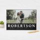 Este libro de fotos incluye tu foto favorita en la parte delantera. Su apellido aparece en un gran tipo de letra blanca con sus nombres y la fecha de boda también en blanco. El fondo es negro por delante y por detrás. "El boda de (nombre de la novia y del novio) y la fecha se enumeran en la columna vertebral. El texto se puede personalizar para adaptarlo a sus necesidades.