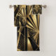 Transform your bathroom into a Great Gatsby masterpiece with this opulent black and gold Art Deco towels. Featuring stunning sunburst medallions, diamond patterns, and radiating geometric lines with a luxurious metallic gold foil effect, this design embodies the height of 1920s sophistication and luxury.