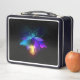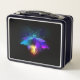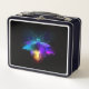 Luciérnagas mecánicas antiguas con bombilla de luz y finas alas brillan naranja, violeta, turquesa sobre fondo negro. Estilo Steampunk.