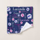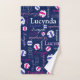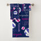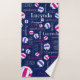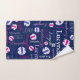 Balones deportivos sobre fondo marino azul oscuro diseñado originalmente para un conjunto personalizado de toallas de nombre o toallas individuales. Estas toallas con motivos deportivos tipográficos de netball tienen netball blancas con una raya rosa, y netball blancas con una franja azul, con texto rosa, gris, azul y blanco que se puede personalizar con tu propio nombre, dice Lucynda. Arte y diseño originales de Sarah Trett para www.mylittleeden.com