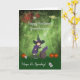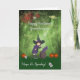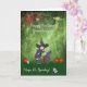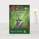 Pequeña tarjeta de saludo de bruja y aliño para tu nieta. El diseño tiene una bruja linda, calabazas, esqueletos, cielo verde con lluvia cayendo y un planeta en el cielo.
