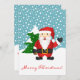 Tarjeta personalizada y festiva que presenta el ilustracion personalizado de Destei de un Santa Claus lindo y feliz vestido con ropa tradicional roja y negra. El Santa tiene una larga barba blanca y está levantando la mano para saludar. Detrás del Santa hay un abeto verde cubierto de nieve. El color de fondo es azul con un patrón de nieve en caída. En la parte delantera se lee "¡Feliz Navidad!" en color rojo y la parte trasera tiene áreas de texto personalizables para mensajes personalizados y de quién es la tarjeta.