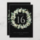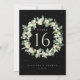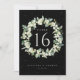 Una tarjeta boda negra de dos caras con números de mesa con bayas de nieve pintadas a mano y eucalipto dispuestos en una hermosa corona botánica. Todo el texto es completamente editable. Otros diseños, productos de números de tabla y artículos de coordinación están disponibles en mi tienda.