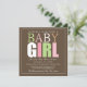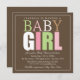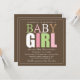 Este diseño presenta las palabras "nena" en coloridas letras pastel sobre un fondo marrón. Los detalles de la ducha para bebés se sientan debajo en blanco.