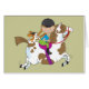 La niña las colas guarras que montan el caballo mecedora colorido con el pequeño perro en el colgante trasero encendido a sus colas del cerdo.