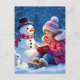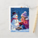 Una linda postal personalizada para Navidades. Una linda niña con un abrigo rosado y un gorra de invierno leyendo un libro de cuentos a un muñeco de nieve y conejo. Un ilustracion acuático de bonito con un ambiente frío en invierno.