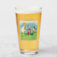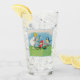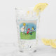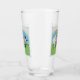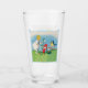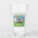 Este vaso para bebidas tiene un pequeño chica rubio vestido de blanco con lindos elfos de Pascua con gorras rojos parados al lado de flores de lirio blanco, huevos de Pascua de colores y un pájaro cantante con un elegante marco azul claro en la parte delantera y trasera.