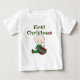 Un lindo bebé con un dormilón verde con un gran adorno de árbol rojo y verde y un tradicional texto rojo y verde que dice "Primera Navidad" en camisetas, bodysutis, bolsas de té y otros artículos que puedes personalizar fácilmente antes de pedir con el nombre de tu bebé!