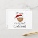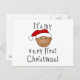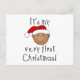 Texto estilo infantil que dice "Es mi primera Navidad" y un bebé afroamericano está vestido con un gorro de Navidad en bolsas de mano, camisetas y más personalizables para la primera Navidad.