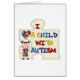 Un pedazo grande del rompecabezas, un corazón integrado por pedazos del rompecabezas, una figura chica cabelludo trigueno del palillo, y el texto que me lee "aman a un niño con autismo" en las camisetas de la conciencia del autismo, las tazas, las tarjetas, los pegatinas, las bolsas de asas, los imanes, los llaveros, los diarios, los mousepads, y otros artículos de la ropa y del regalo.