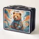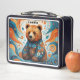 Un oso marrón adorable decorado con círculos concéntricos coloridos, y los colores giratorios en el fondo hacen una caja de almuerzo para un niño o chica.